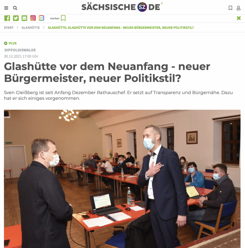 Als Bürgermeister von der Gemeinde Glashütte finde ich in vielen Artikeln der Medien Erwähnung. Ich möchte diese journalistische Arbeit nicht unerwähnt lassen und liefere an dieser Stelle meiner Webseite eine entsprechende Übersicht über die letzten Presseerzeugnisse, welche ich gern mit Ihnen teilen möchte. Haben Sie einen spannenden Artikel entdeckt, den ich noch nicht betrachtet habe? Dann senden Sie mir diesen doch gern zu und ich werde mir diesen durchlesen. Zum Originalartikel gelangen Sie in dem Sie auf das Bild klicken.